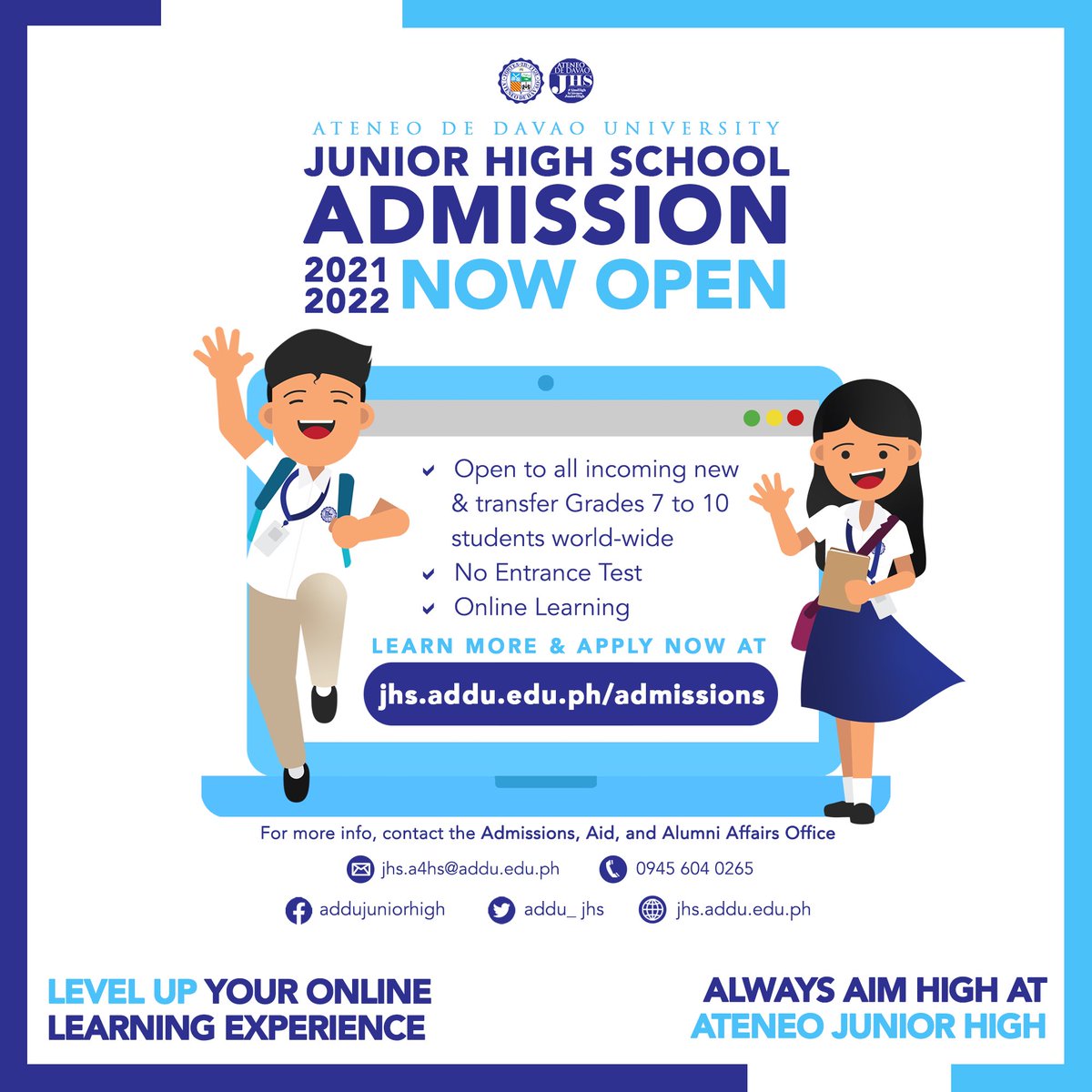 Addu Junior High School On Twitter Announcement Jhs Admission For Sy 2022 2022 Opens On Monday January 25 2022 Level Up Your Online Learning Experience Now Aim High At Addu Junior High